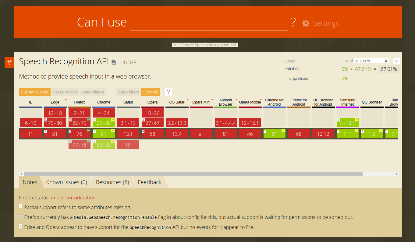 But speech recognition is used mainly in applications on native platforms and is not very common in the browser web. This is probably because the browser has restrictions on the use of the microphone related to privacy and security, and of course, due to the low browser support.
