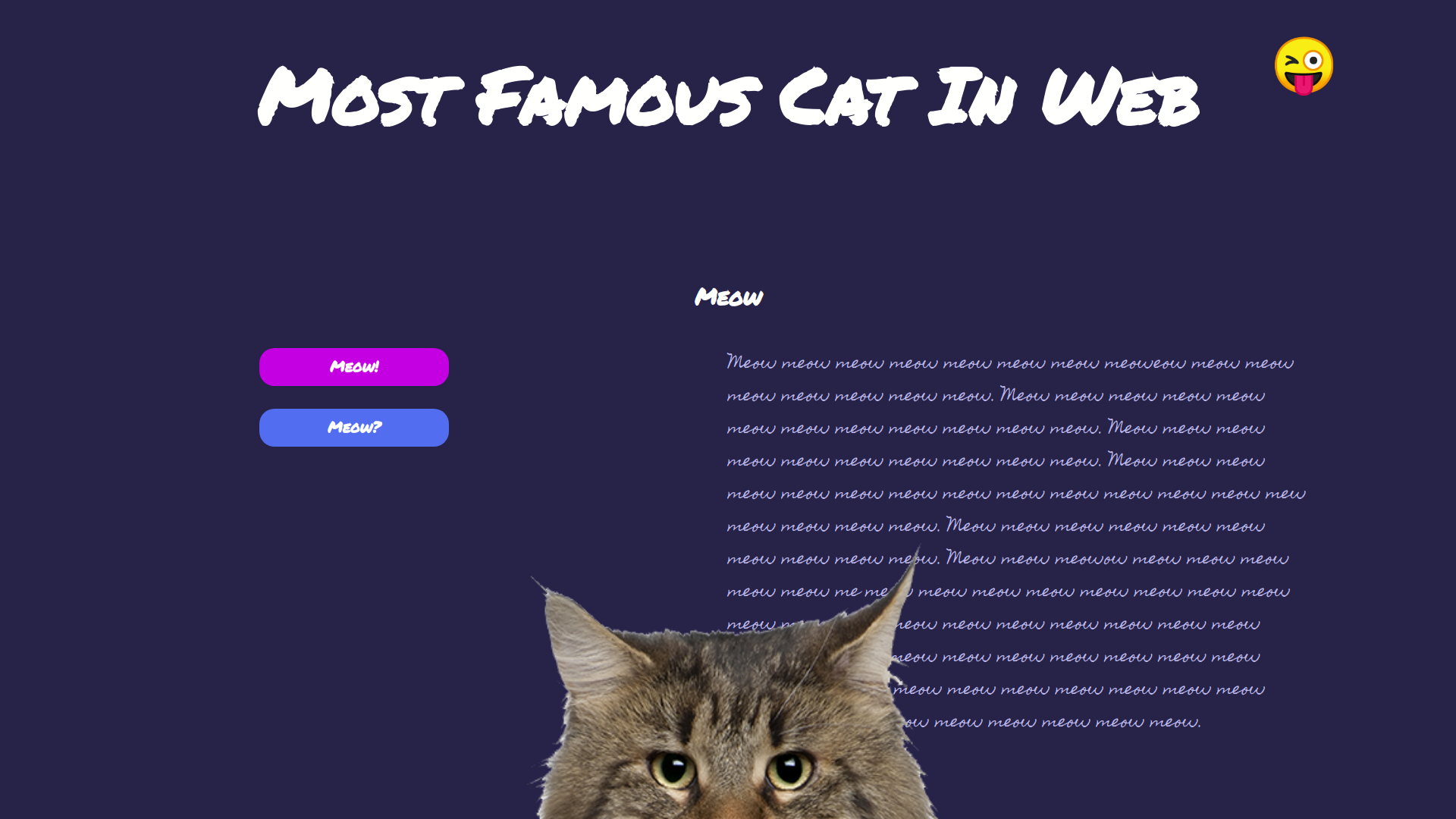 <!DOCTYPE html> <html lang="en"> <head> <meta charset="UTF-8"> ... <title>Karasique's Page</title> </head> <body class="page theme theme_dark1"> <button class="button toggler" id="speech-btn">😜</button> <h1 class="heading">most famous cat in web</h1> <p class="output"></p> <section class="section"> <h2 class="heading"> Meow </h2> <div class="wrapper"> <ul class="list"> <li class="list__item"> <button class="button button_red">Meow!</button> </li> <li class="list__item"> <button class="button button_green">Meow?</button> </li> </ul> <p class="paragraph"> Meow meow meow meow meow meow meow meoweow meow meow ... meow meow meow meow. </p> </div> </section> <img class="photo" src="/image.png" alt="Karasique" width="700"> <script src="script.js"></script> </body> </html>